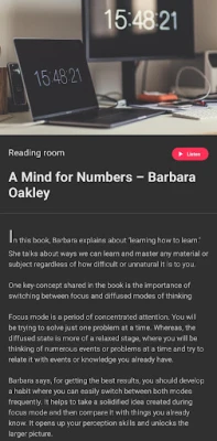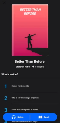 Lietotnes ekspertu veidots saturs nodrošina, ka jūs gūstat vērtīgas atziņas no starptautiskiem bestselleriem un nozīmīgām publikācijām. Izpētiet jaunākos trendus politikā, ekonomikā un citās jomās, vai arī ienirstiet romānu un klasikas kopsavilkumos. Kategorijas aptver visu, sākot no finanšu izpratnes un beidzot ar daiļliteratūras spēku, piedzīvojumiem, šausmām un iedvesmojošām biogrāfijām. Šī lietotne ir jūsu uzticamais resurss, lai efektīvi un patīkami apgūtu jaunas prasmes un veidotu plašāku izpratni, sniedzot grāmatu būtību kompakti un pieejami, nekad nepiedāvājot pilnus grāmatu tekstus vai audio grāmatas.